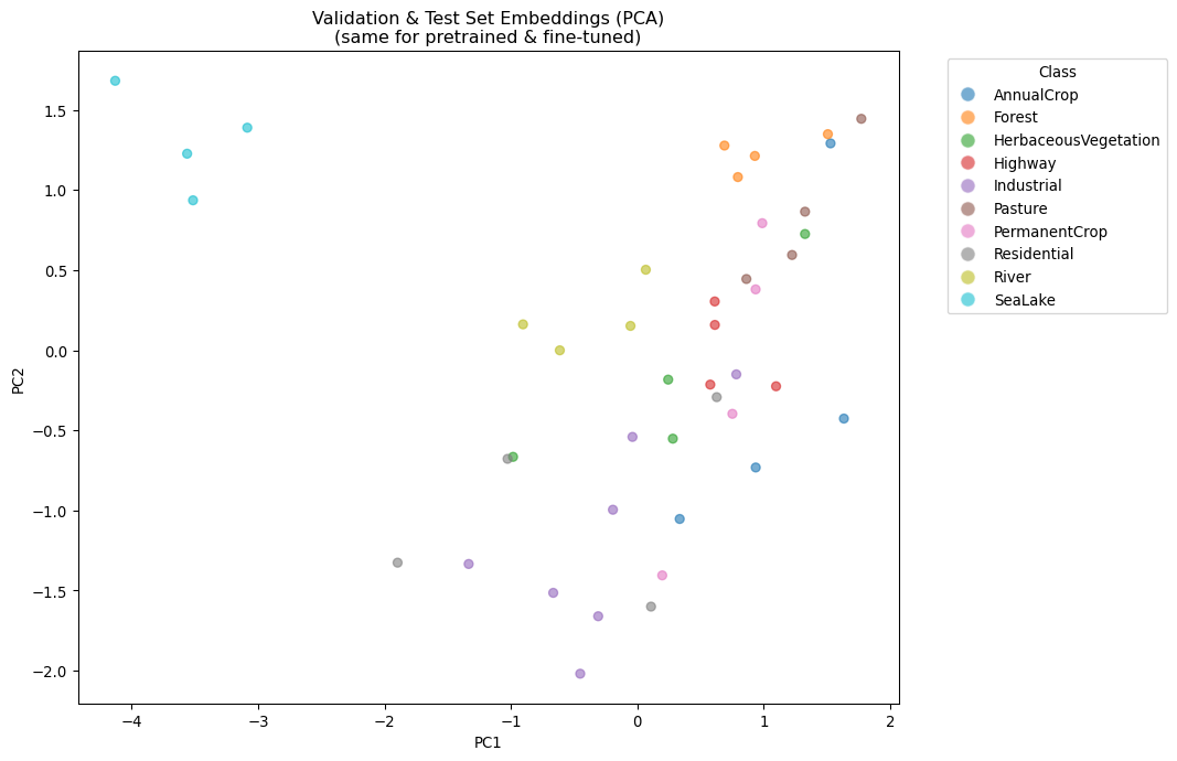 Letβs visualize the embeddings of the pretrained and fine-tuned models to see how the classification head might have learned to separate classes, even though the backbone embeddings remain unchanged.